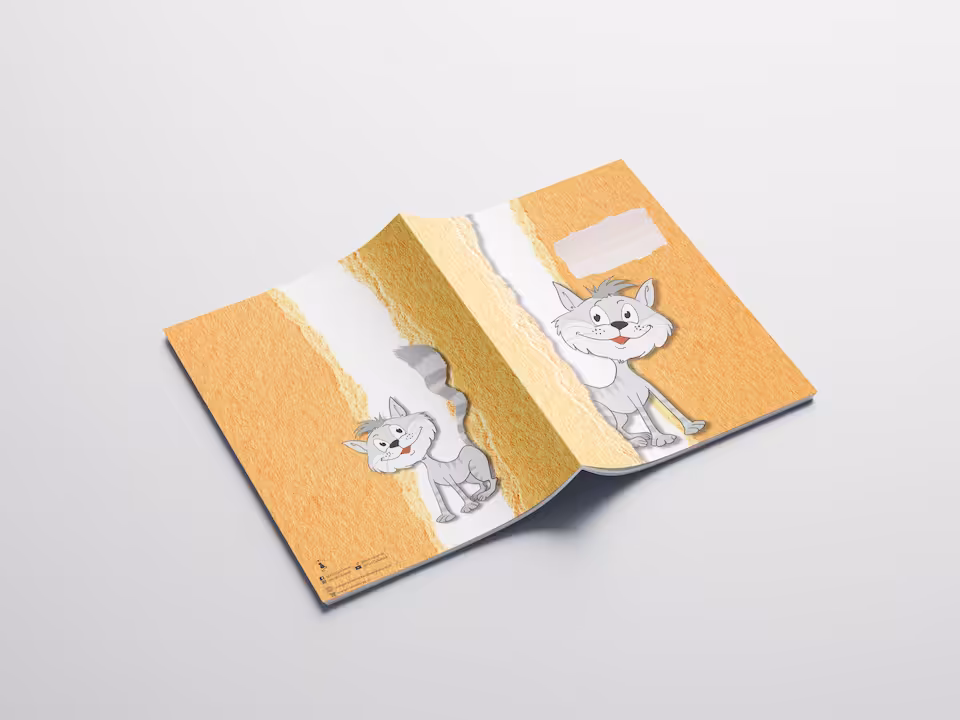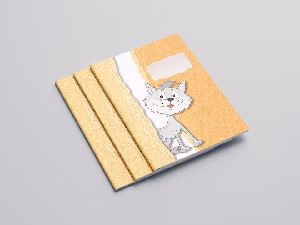 Okładka: żółta, kreda błysk 300 g, z kolorową grafiką kota Cukierka