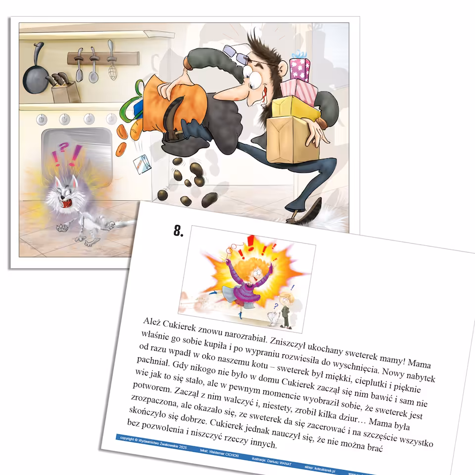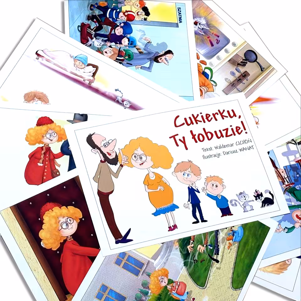 Karty narracyjne do teatrzyku kamishibai w oparciu o lekturę szkolną Waldemara Cichonia "Cukierku, Ty łobuzie!"
